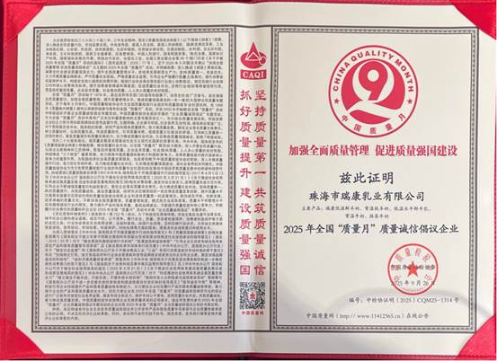 在9月举行的中国质量月活动中,瑞康乳业凭借其卓越的质量管理体系和稳定的产品质量,荣获中国质量检验协会颁发的”全国质量检验稳定合格产品““全国行业质量领先企业”和“全国产品和服务的品质诚信品牌”等公告证明。